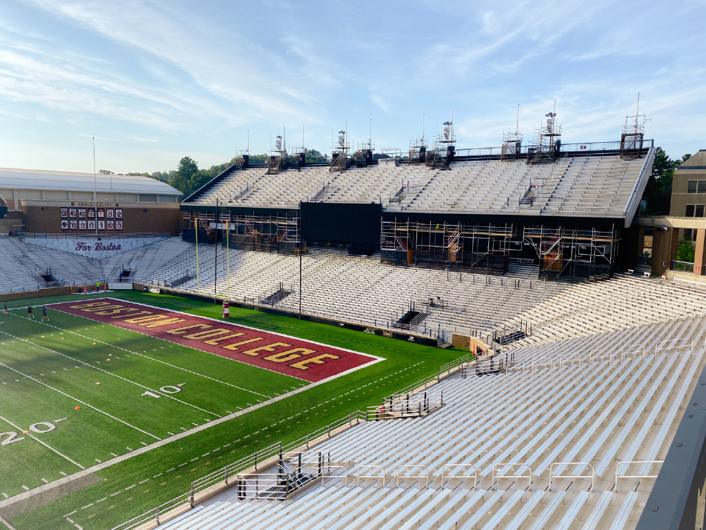 Alumni Stadium, home of the Boston College Eagles, is a football stadium located on the lower campus of Boston College in Chestnut Hill, Massachusetts, approximately 6 miles west of downtown Boston. The stadium was built in 1957 and has a seating capacity of 44,500 fans and is known for its electric atmosphere on game days. The stadium has undergone several renovations over the years, including the addition of luxury suites and a new video board. It is also used for other events, such as concerts and high school football games.