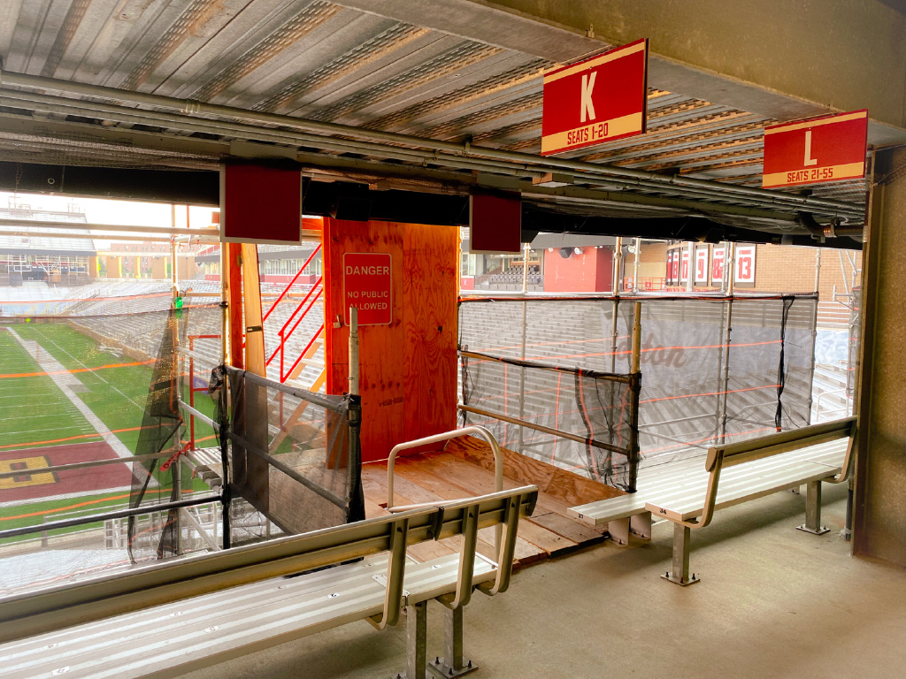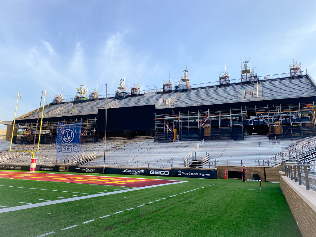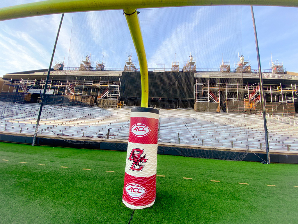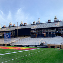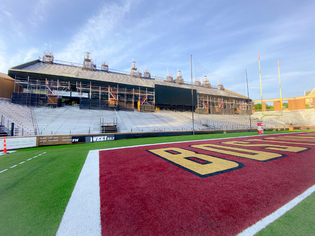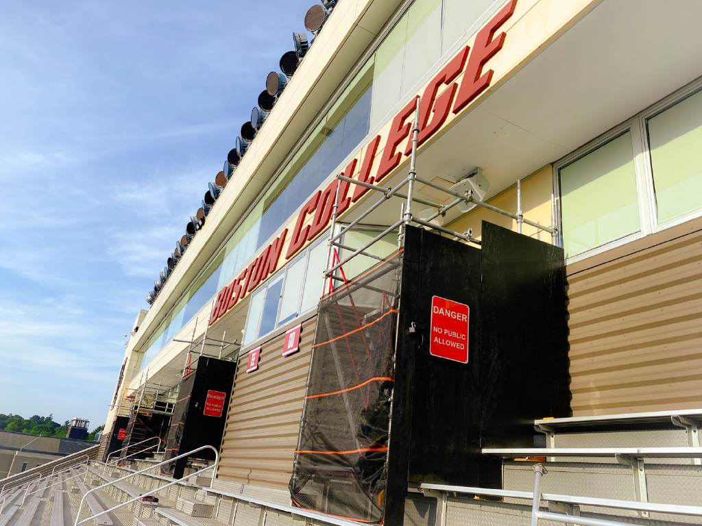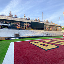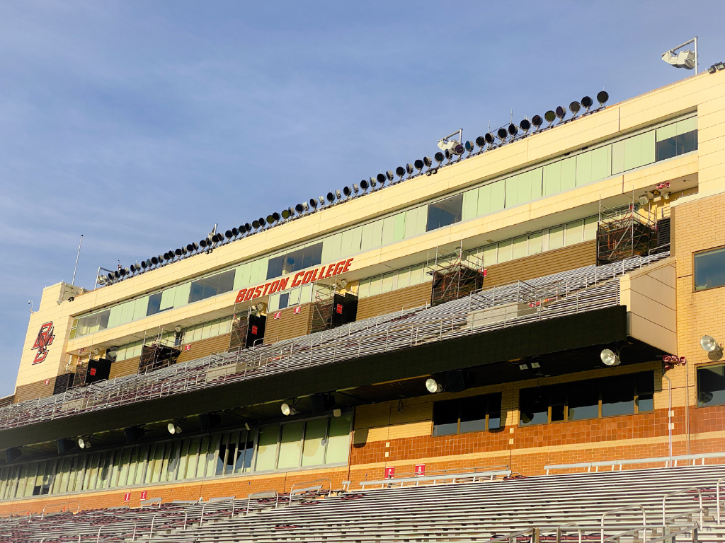 Alumni Stadium, home of Boston College Eagles footbal team, originally seated 26,000 fans. In 1994 the stadium was enlarged, bringing the total total capacity to 44,500. The redesign included the construction of sideline bleachers and two-tiered structures added at each end-zone. Other architectural details were added to the stadium’s facade to blend into the local architecture.