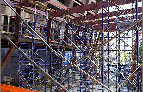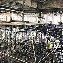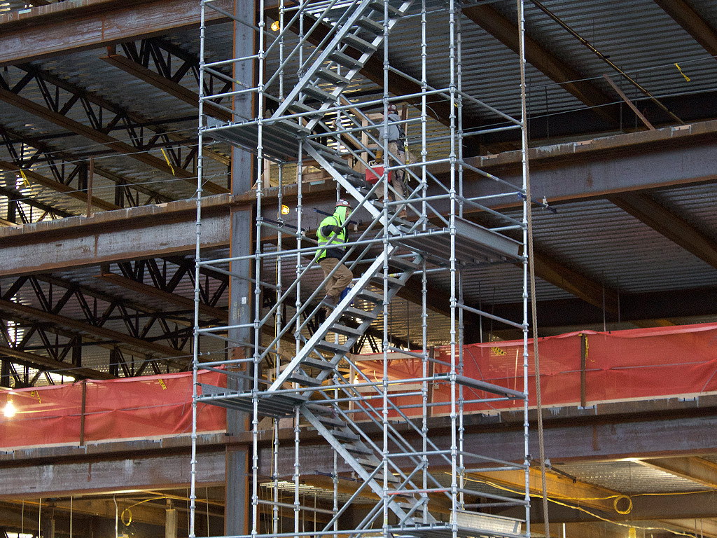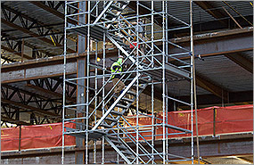 Properly erected scaffolding provides workers safe access to work locations, level and stable working platforms, and temporary storage for tools and materials for performing immediate tasks.