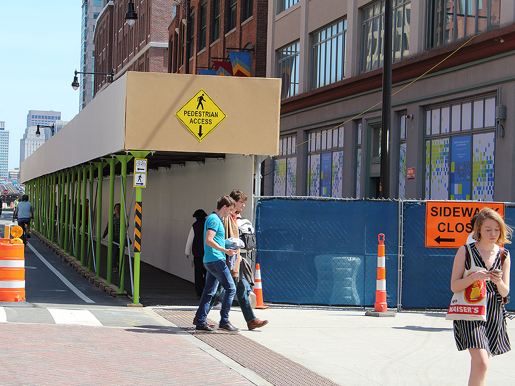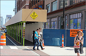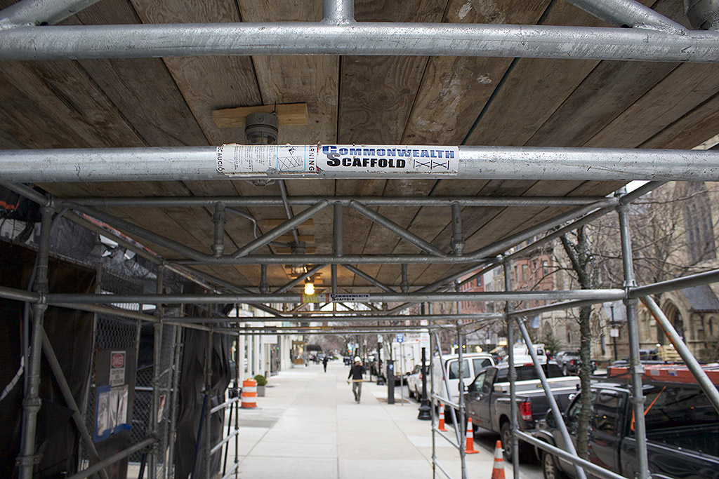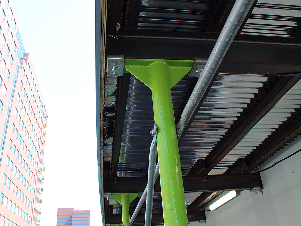 Heavy-duty protection against falling debris which are intended to protect the general public from falling objects during construction. Unlike scaffolds, which are governed by State or Federal OSHA regulations to protect the safety for workers, sidewalk canopies must be built in accordance with municipal building codes.